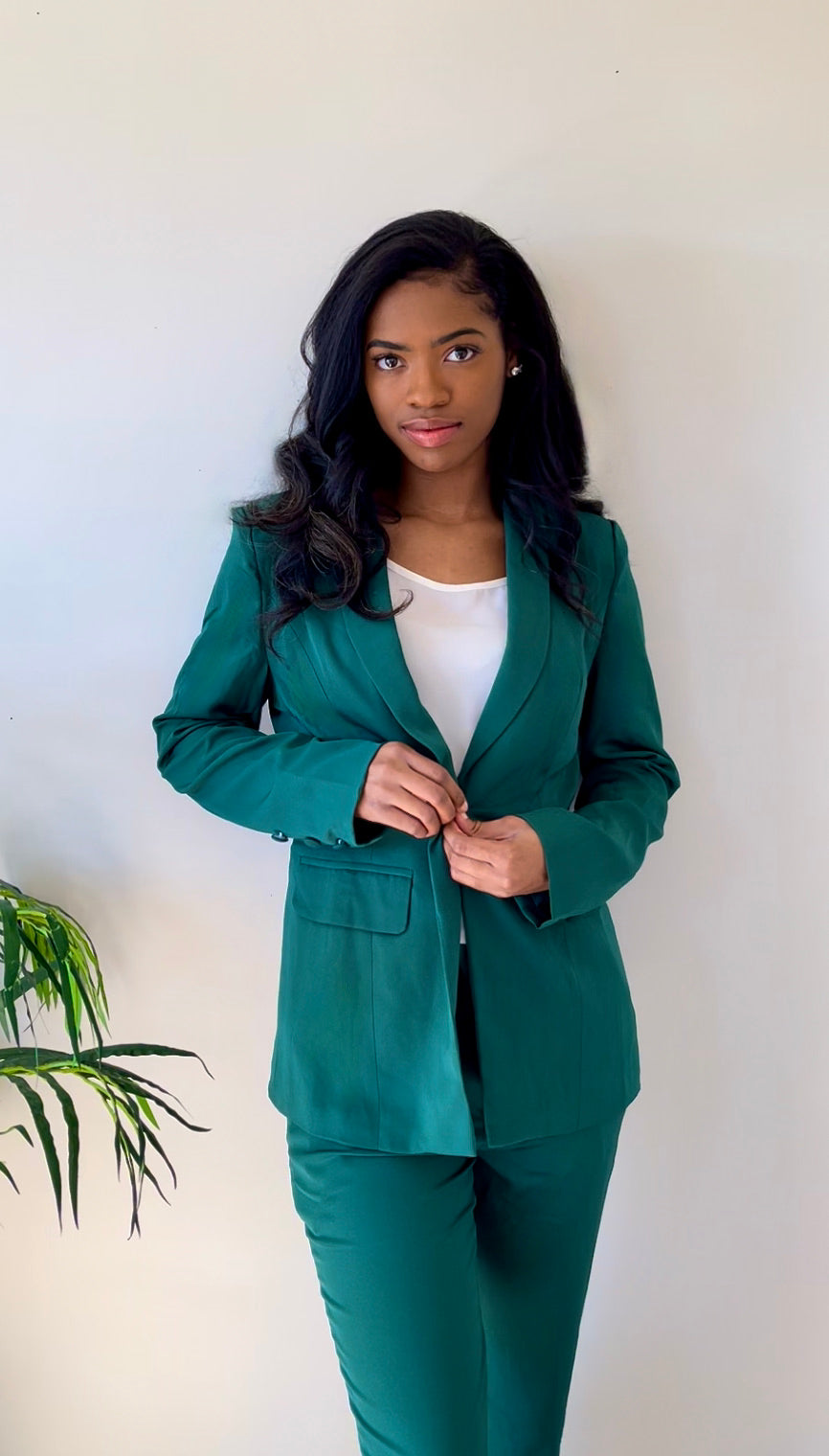 DETAILS: -One button blazer jacket & tapered trouser set -Long sleeve jacket -Thin shawl lapel detail -Button detail at cuff & center front -Princess seam detail -Side faux-welt pocket with flap detail -Center front single button closure -Tapered trousers with side pockets -Mid rise -Full length trousers